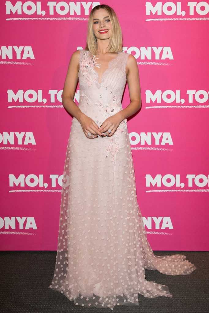 O vestido da marca, o cabelo e a maquiagem eram uma clara homenagem à atriz Sharon Tate, que Margot Robbie personificava em Era uma Vez em Hollywood. A ocasião era a pré-estreia do filme em Hollywood