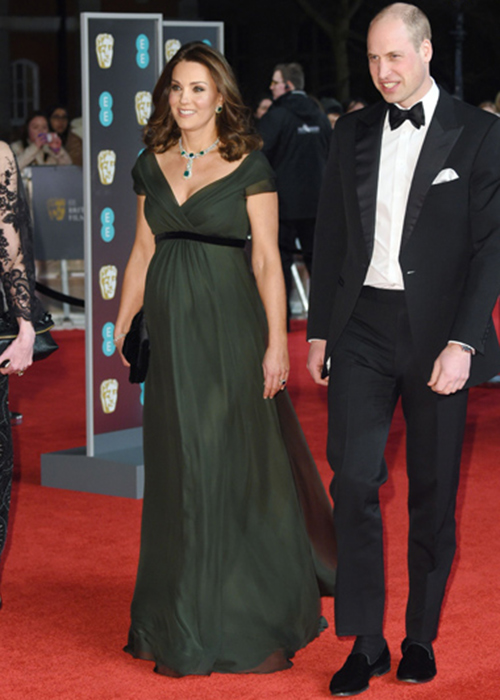 A duquesa Kate vai sempre ao BAFTA acompanhada do príncipe William. No BAFTA de 2018, ela estava grávida do príncipe Louis, e arrasou com um vestido verde musgo de Jenny Packham. Isso sem contar as jóias reais de diamantes e esmeraldas.